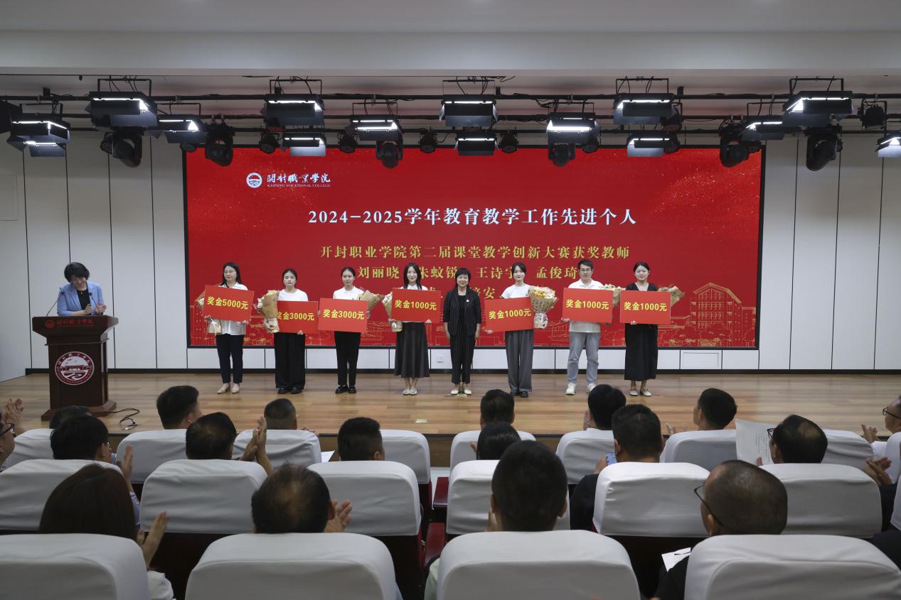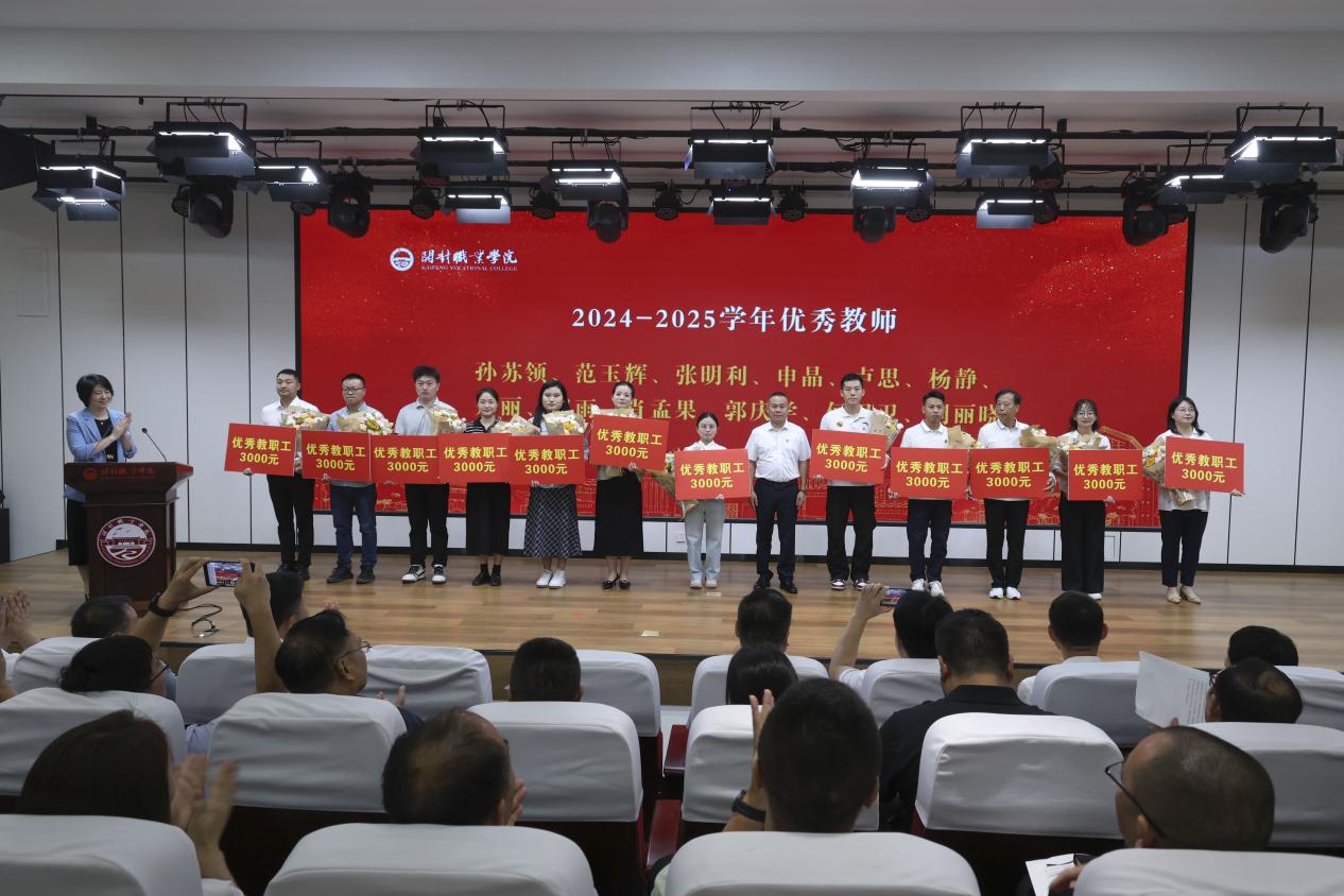 大会在庄严的国歌声中拉开帷幕。刘珊珊带领全体教职工共同学习习近平总书记关于“大力弘扬教育家精神,为党育人、为国育才”重要论述节选,重温总书记对教师的殷切期望,号召大家争做“四有”好老师、当好“四个引路人”,坚守教育报国初心,担当立德树人使命。副校长张涤非宣读《开封职业学院关于表彰2024-2025学年优秀单位及个人的决定》和《关于表彰2024-2025学年在教育教学工作中取得优异成绩的先进个人的决定》。在全场教职工的热烈掌声中,校领导为获奖教师颁发荣誉证书与奖品。徐仲昆校长以“筑牢共同体意识,以教育家精神引领新阶段内涵式发展”为题发表讲话。