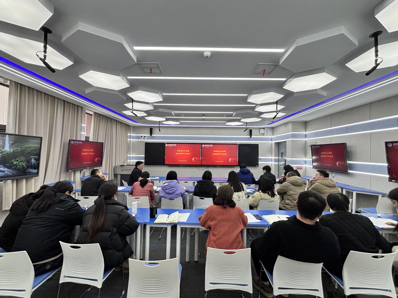 为确保学院各项重点任务有序推进、落地见效,扎实做好期末教学收尾及新学期筹备工作,1月5日,马克思主义学院在毕昇楼212教室召开全体教师会议,围绕脚本完善、集体备课、期末监考及新春团拜会节目筹备等工作做出具体部署。会议由我院院长主持,全体教师参会。