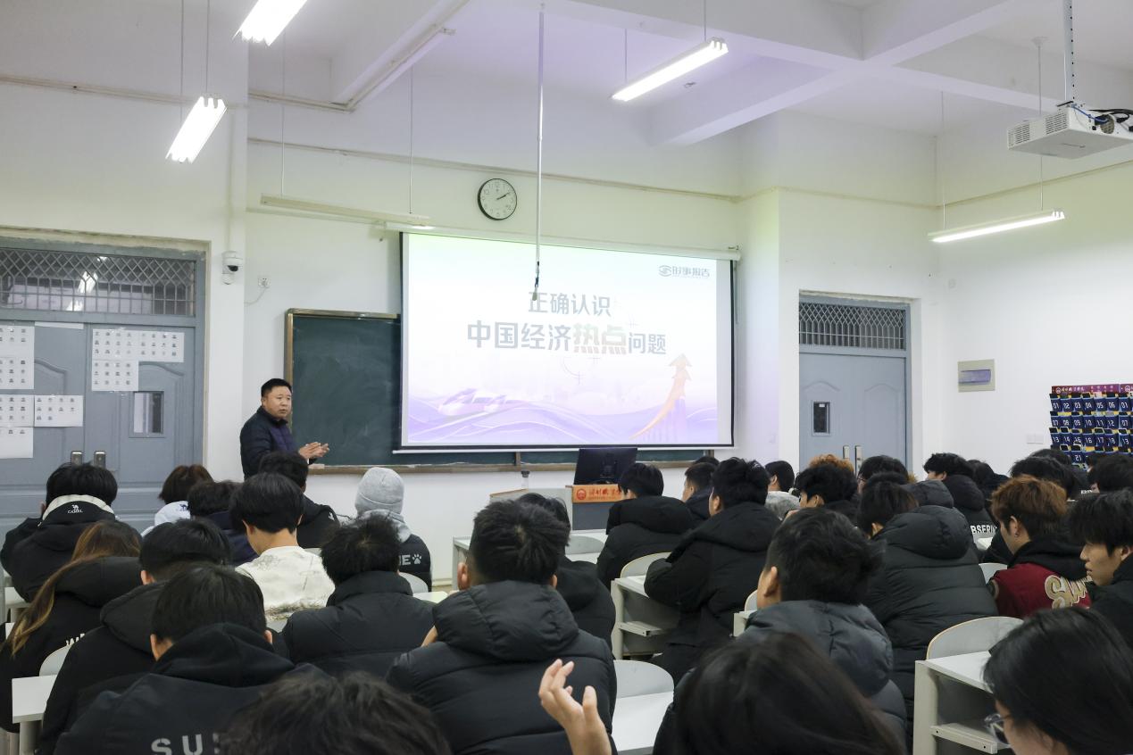授课伊始,马纪岗立足2025年中国经济宏观背景,结合中央经济工作会议精神指出,当前中国经济正处于顶压前行、向新向优关键阶段,准确把握经济热点是青年理解国家大局、找准成长定位的重要前提。他围绕“稳中求进、提质增效”政策取向,解读经济发展核心逻辑,阐明“稳”与“进”“质”与“效”的辩证关系,让同学们深刻认识我国经济的强大韧性与活力。